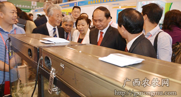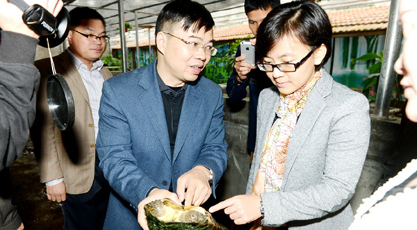 越南农业与农村发展部副部长武文捌、中国渔业协会会长齐景发参观金钱龟养殖大户王熙成展位